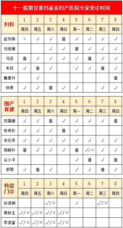 下面公布甘肃玛丽亚妇产医院国庆中秋期间专家坐诊表,女性朋友可根据自己的情况选择自己喜欢的专家就诊!